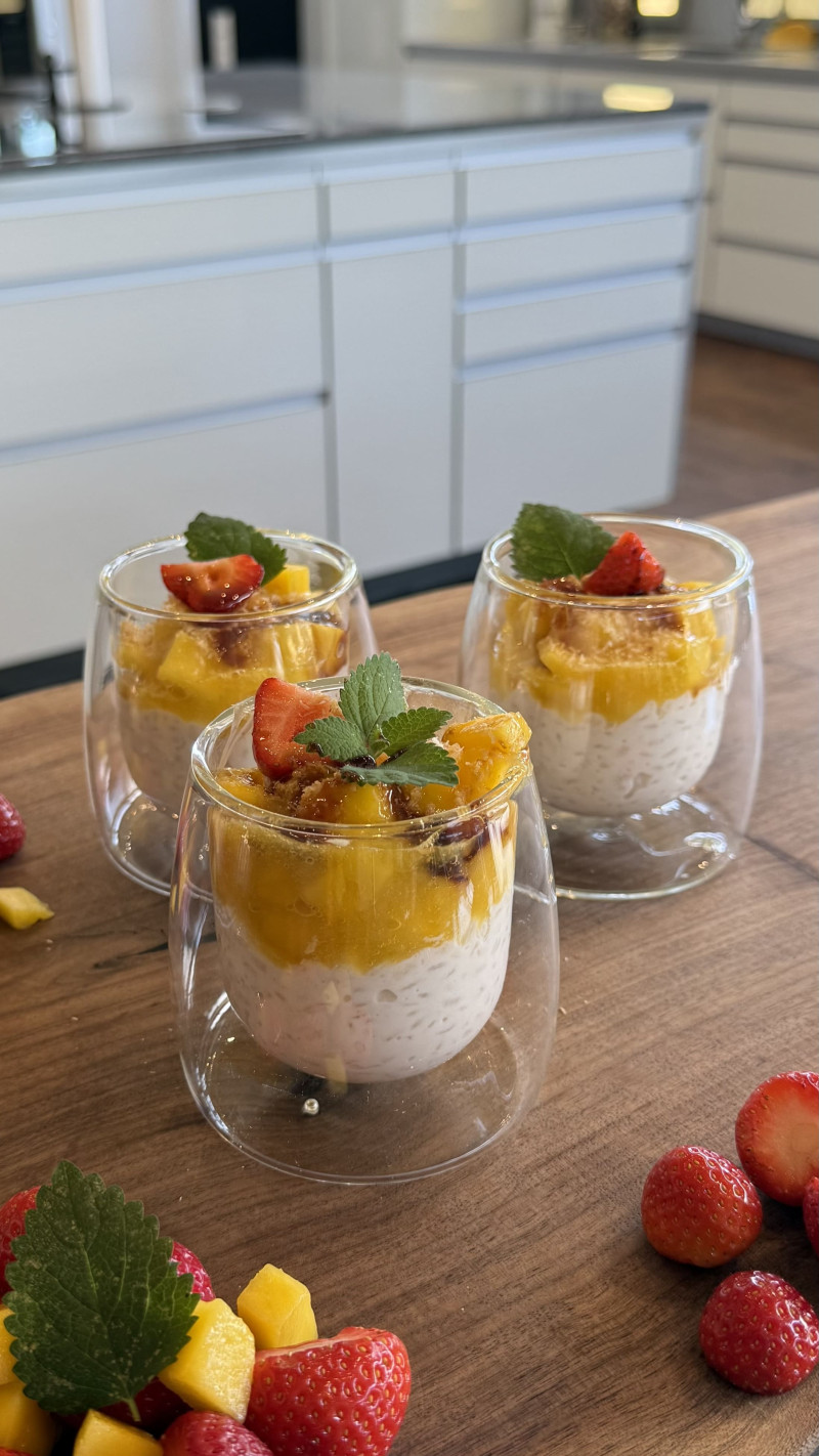 Milchreis im Glas anrichten, dann die Mango und zum Abschluss die Raspel.